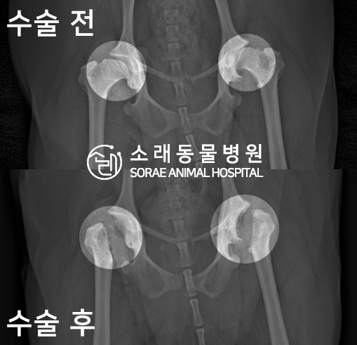 수술 전과 수술 후 촬영한 고관절 방사선 사진입니다.