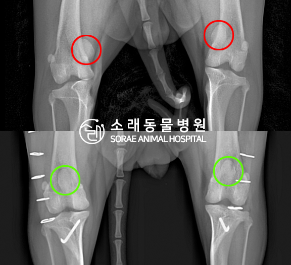 수술전과 수술후에 촬영한 땅콩이의 슬개골