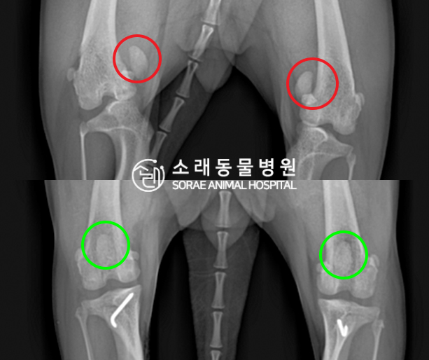 수술전과 수술후에 촬영한 코코의 슬개골