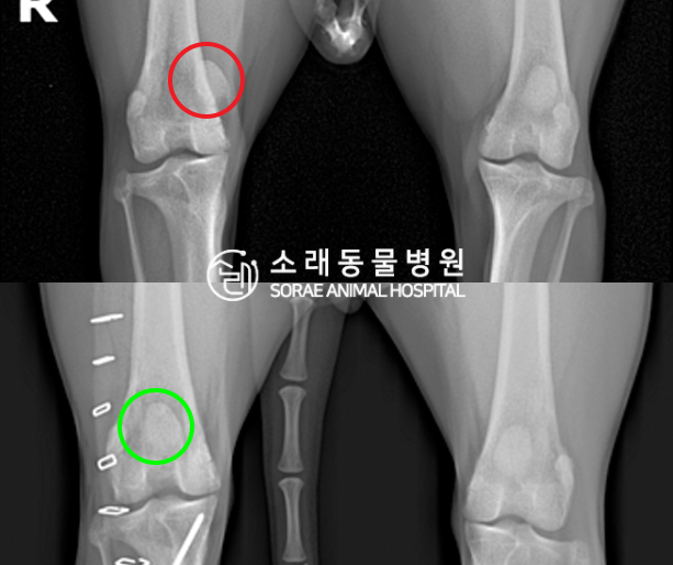 수술전과 수술후에 촬영한 아롱이의 슬개골
