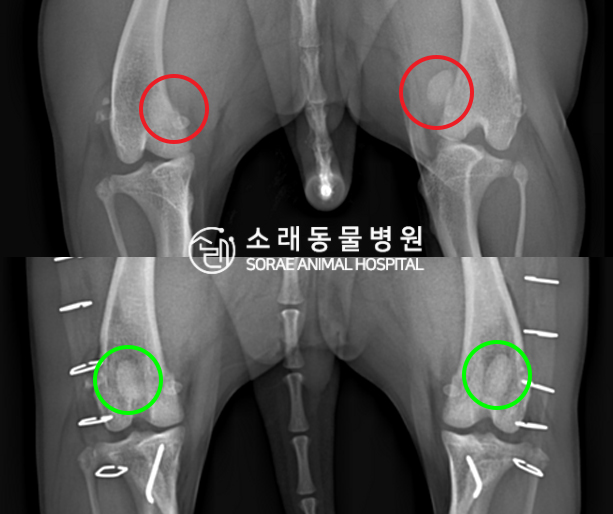 수술전과 수술후에 촬영한 봉지의 슬개골