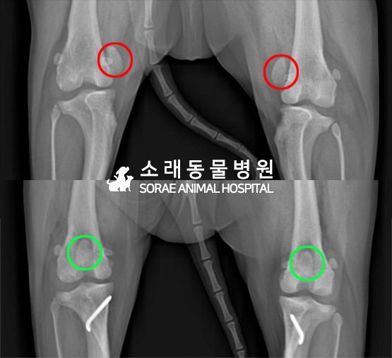 수술전과 수술후에 촬영한 슬개골 방사선 사진입니다.